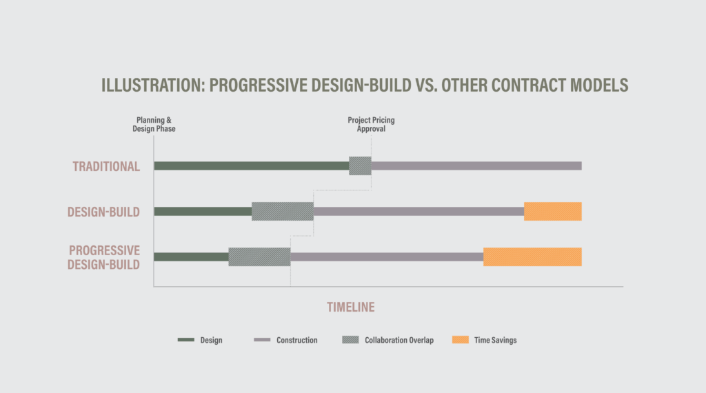 Rather than being caught off guard by rising costs or delays, with progressive design-build, clients get timely updates and the opportunity to adjust strategies and find solutions that align with their budget and other important project criteria.